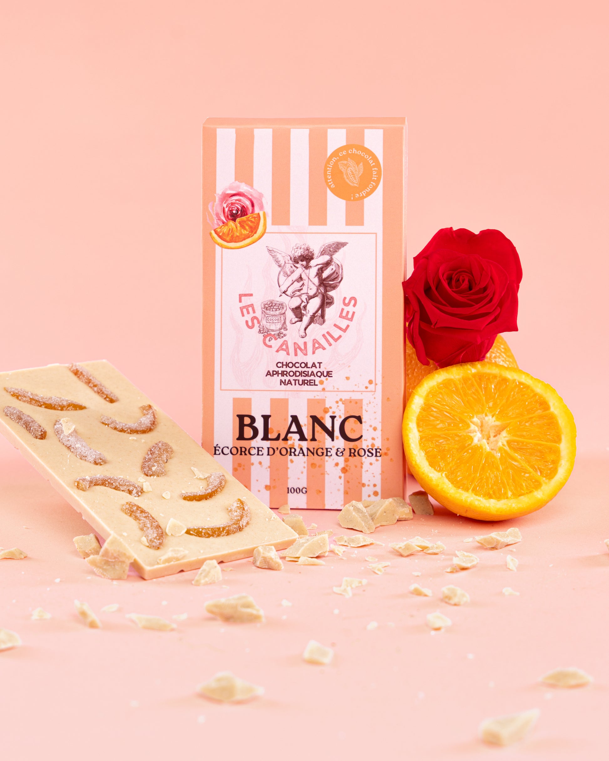 Tablette chocolat aphrodisiaque • Blanc, écorce d'Orange et Rose • 100g